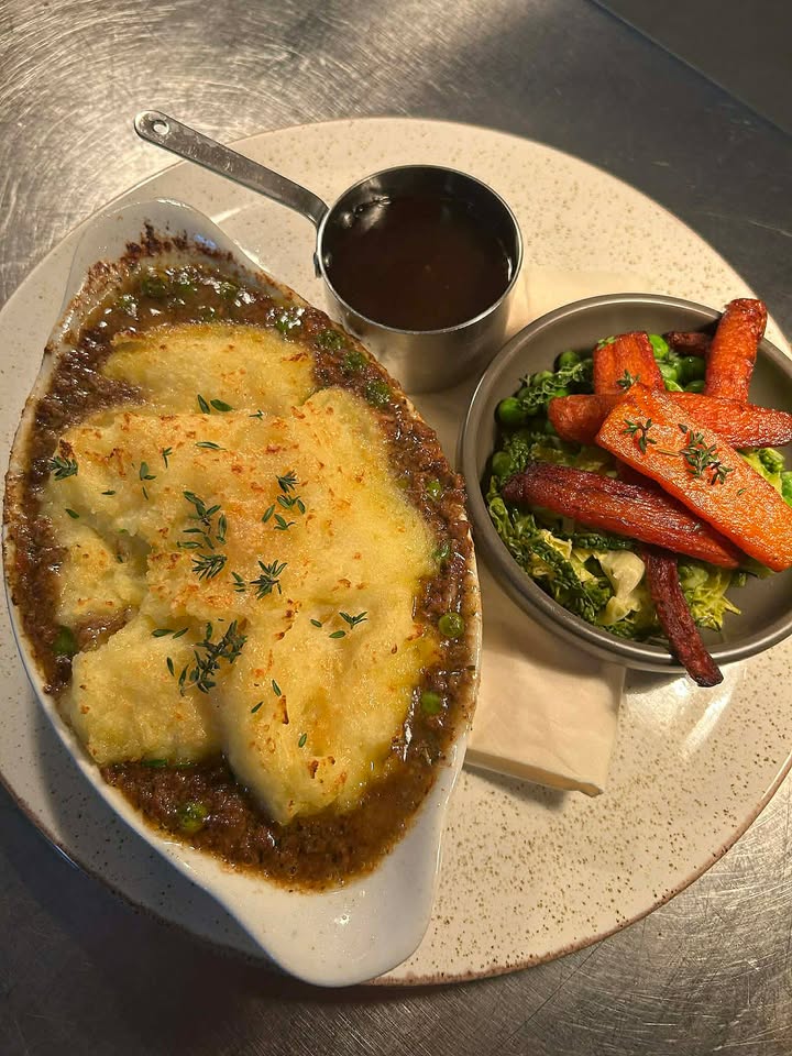 A good helping off Cottage pie served with a side of vegetables 😋